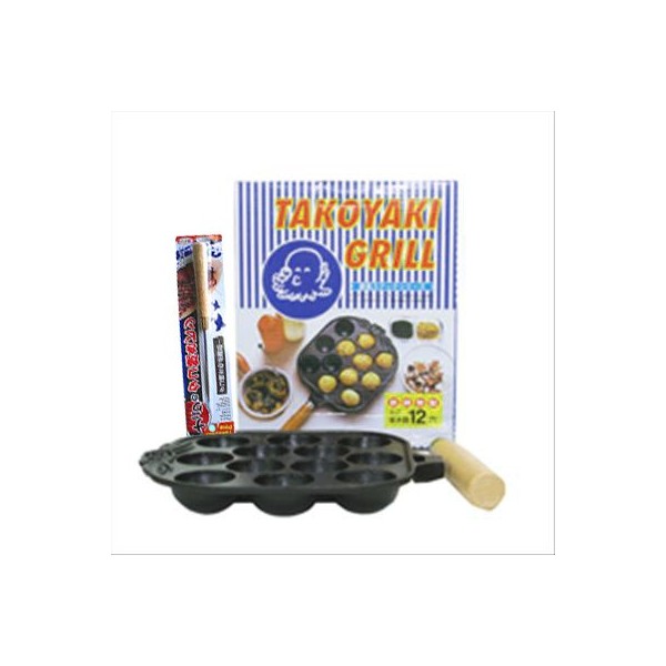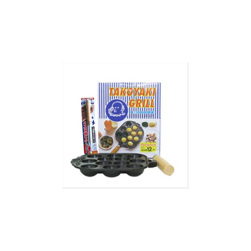 This iron takoyaki pan measures 7 inches across and has one wooden handle. This takoyaki pan makes up to 12 pieces of takoyaki (octopus fritters) at a time, each measuring about 1 3/4 inches across. Simple recipe and turning pick are also included