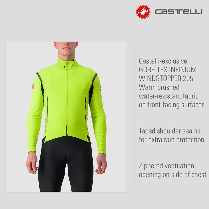 - FRONT FABRIC: Castelli-exclusive Gore-Tex Windstopper Infinium 205 Warm brushed water-resistant fabric on front-facing surfaces to block wind and keep you warm.