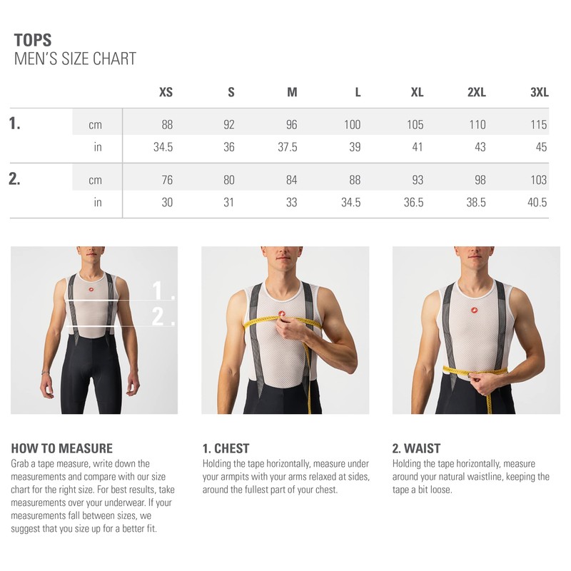 - SIZING: Castelli products have a close-to-the-body fit to maximize aerodynamics and performance. For a less compressive feel, or if your measurements fall between sizes, we recommend that you size up.