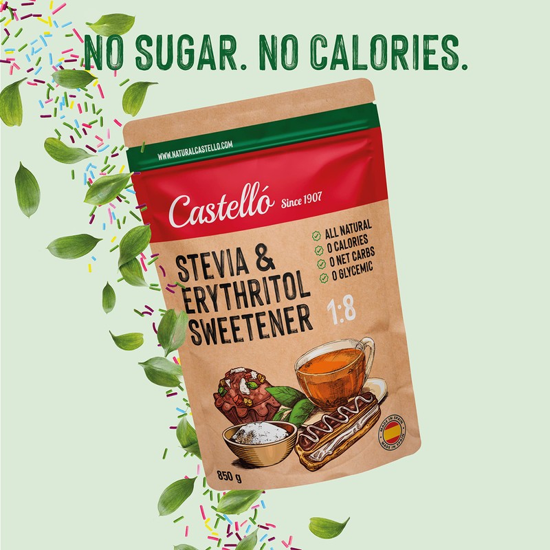 - Castello since 1907 Stevia + Erythritol 1:8 sweetener is the perfect sugar substitute for those looking to maintain a healthy lifestyle. It is 100% natural and has zero calories and carbs, making it suitable for any diet. Its sugar-like texture makes it easy to dissolve in hot and cold beverages, as well as for baking and cooking. This sweetener is suitable for the whole family, vegans and vegetarians, and it's even safe for pets.
