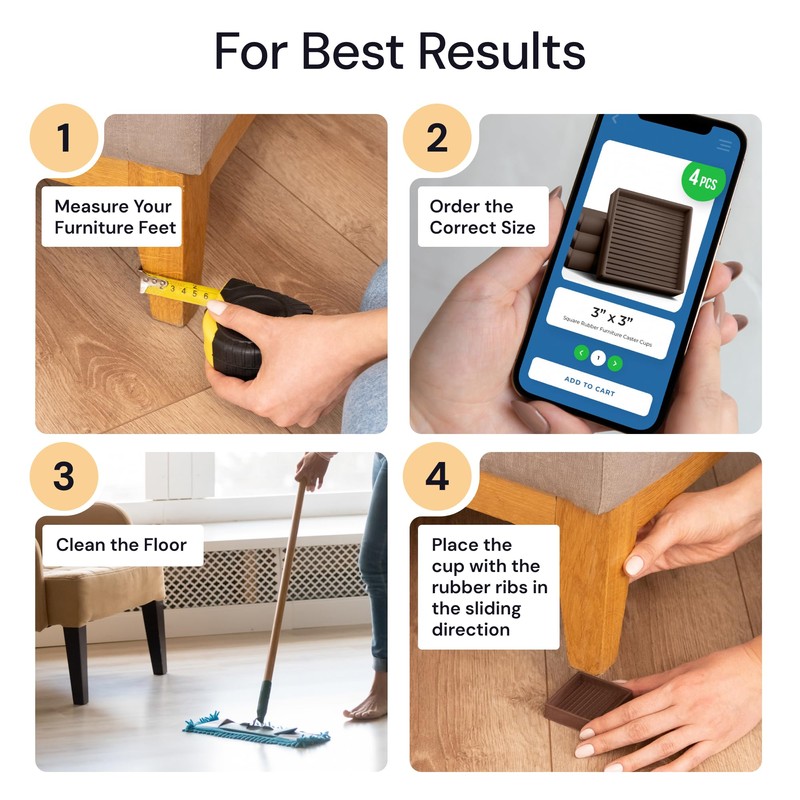 - Noise Reduction Innovation: Our premium rubber caster cups feature noise-dampening technology to minimize annoying squeaks and scuffs. Enjoy quieter spaces while maintaining the integrity of your floors with our innovative floor protectors for chairs and furniture