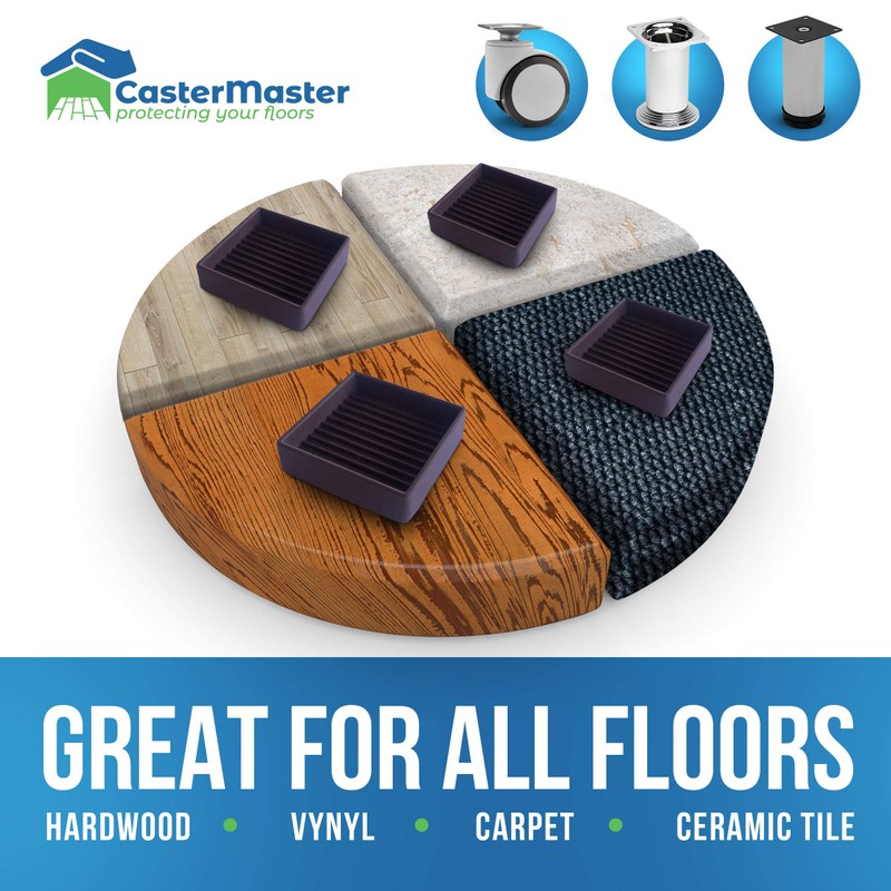 • PROTECTIVE GUARD: What types of flooring can protective guards be used on? Hardwood, vinyl, carpet, ceramic tile, or cement flooring- Caster Master is here to protect them all. Our cups are made with anti-slip flexible rubber, designed to grip your floor and hold your furniture in place.