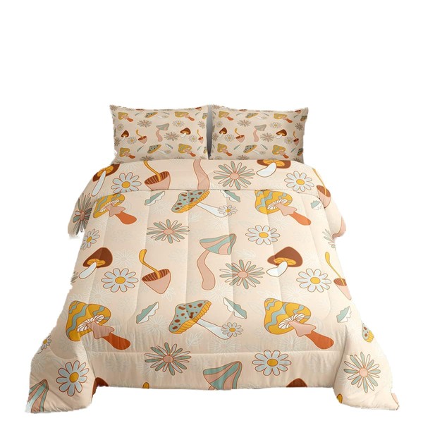Castle Fairy 60s 70s Retro Mushroom Comforter Set Full Size,Groovy Flowers Floral Bedding Comforters for Girls Teens Gift,Boho Art Quilt Set with 2 Pillowcases,Chic