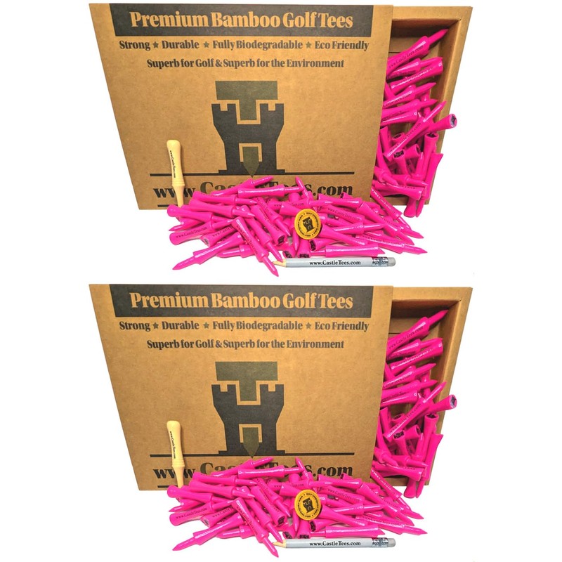 Castle Tees Pink Originals 2 Pack – 100 pcs x 60mm 2 1⁄3 inch Premium Bamboo Golf Tees Free Pitch Repair Tool, Ball Marker & Pencil. Twice the strength of regular bamboo very strong Great Golf Gift.