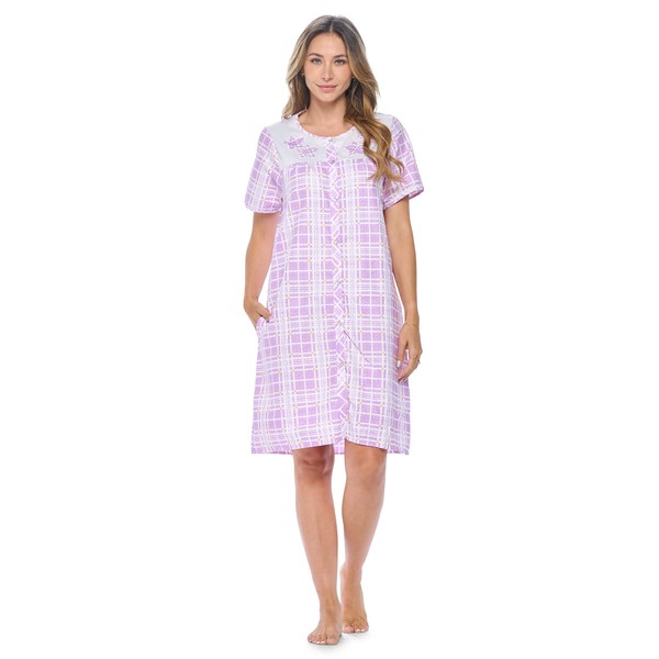 Casual Nights Womens Snap Front House Dress Short Sleeve Woven Housecoat Duster Lounger Robe, Plaid Light Purple, Large