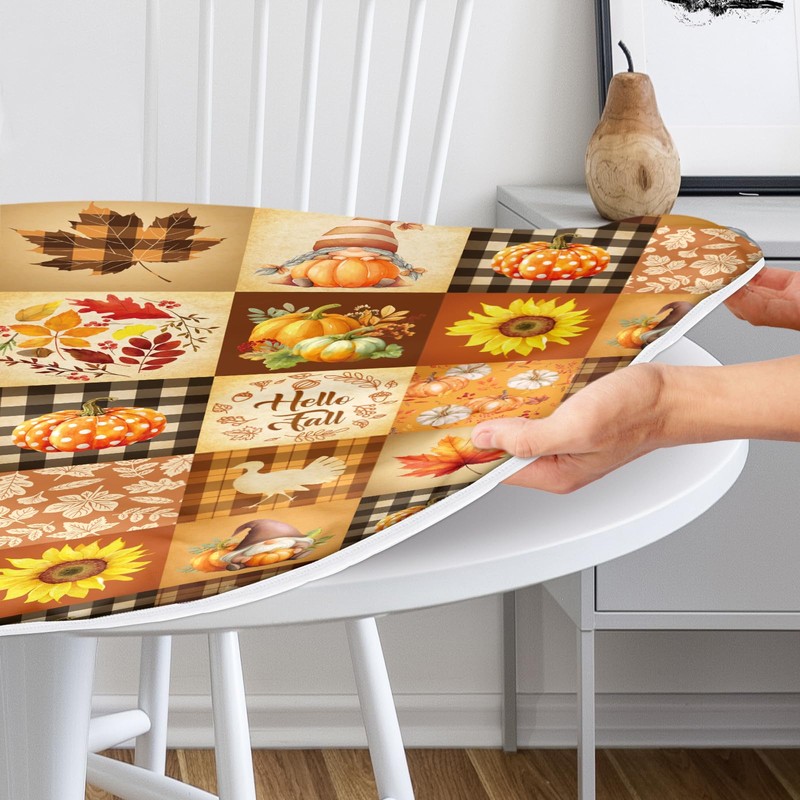 - Fall Decorative Tablecloth: The autumn decor fitted tablecloth round with bright color and clearly printed, add pumpkin maple leaf, cute fall gnome, sunflower, brown and orange buffalo plaid and other classic retro harvest Thanksgiving elements, which add a joyful touch to your life .This round fitted table cloth can not only bring new ideas and fun to life, but also can be used as a gift for your friends.
