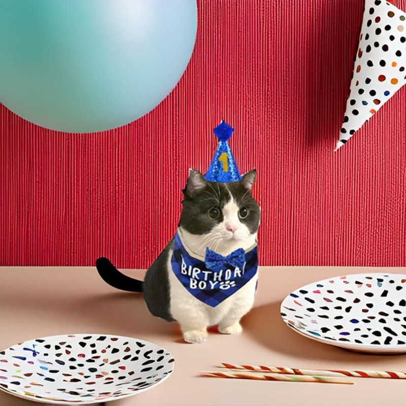 - Cat Birthday Party Supplies: this cat birthday set contains 8 cat birthday balloons, 10 shiny birthday numbers, 1 cat birthday banner, 1 cat birthday party and 1 cat birthday party hat. A cat birthday scarf with a birthday child printed on it. In terms of everything needed for a pet party and bring a few surprises to your adorable pets.