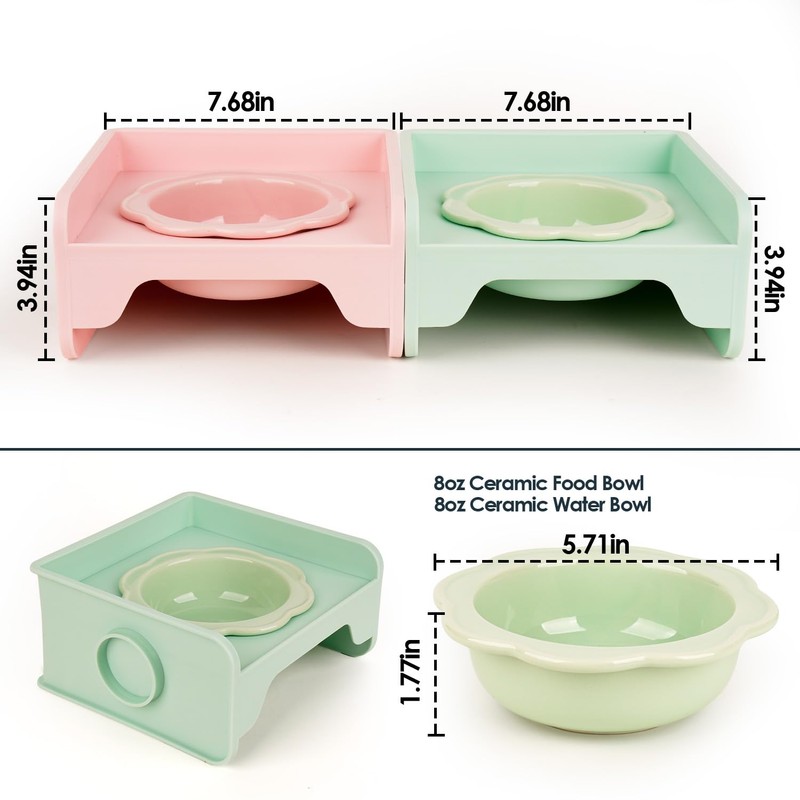 - PROVIDE COMFY FEEDING POSITION: The ergonomic elevated plastic stand helps protect your pet's neck, and reduce the pressure on the pet's spine and stomach, which makes them feel more at ease when eating and reduces vomiting after meals, good for your dog or cat's health.