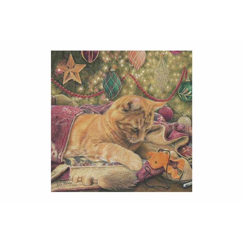 Cat Christmas Card - Xmas Scene with a Ginger Cat and Toy in a Homely Scene. Seasonal Greeting Cards Printed Inside. Recyclable. 'Christmas Present'