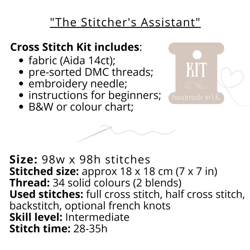 Cat Cross Stitch Kit "The Stitchers's Assistant" with Threads, Fabric, Needle and Instructions HANDMADE