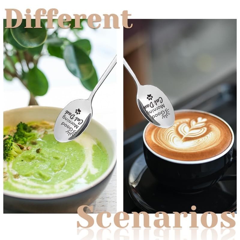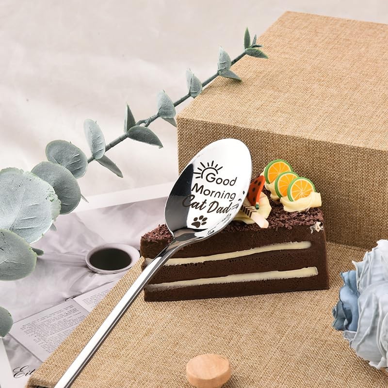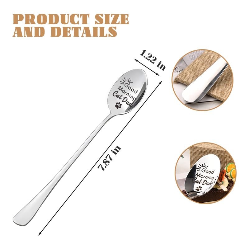 - High Quality of Cat Dad Good Morning Spoon: The cat dad ice cream spoons are 7.67 in, weight 23 grams, made of stainless steel, smooth,resistant,no rust and no fade, and washes well dishwasher safe, the cat dad engraved spoon is cat lover gifts for men boyfriend, cat pet lovers for men cat owner