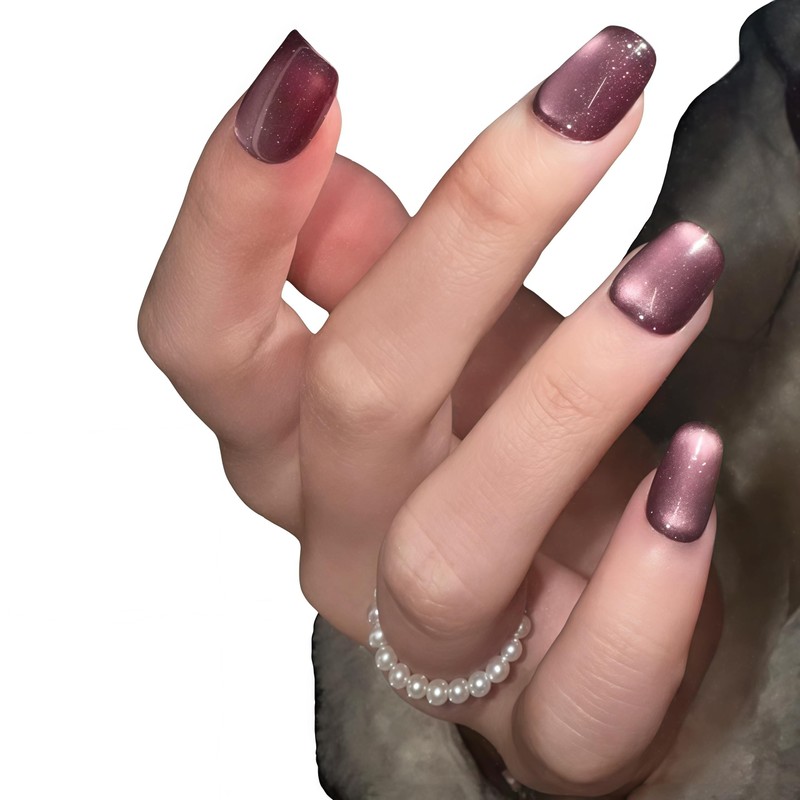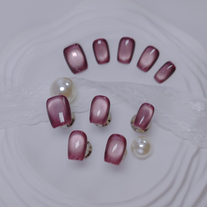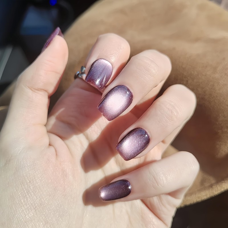 Cat Eye Press on Nails Handmade Short Oval/Square/Round False Nails with French Tip/Aurora/Magnetic Shimmer Designs (Shimmer#Square Plum, Large)