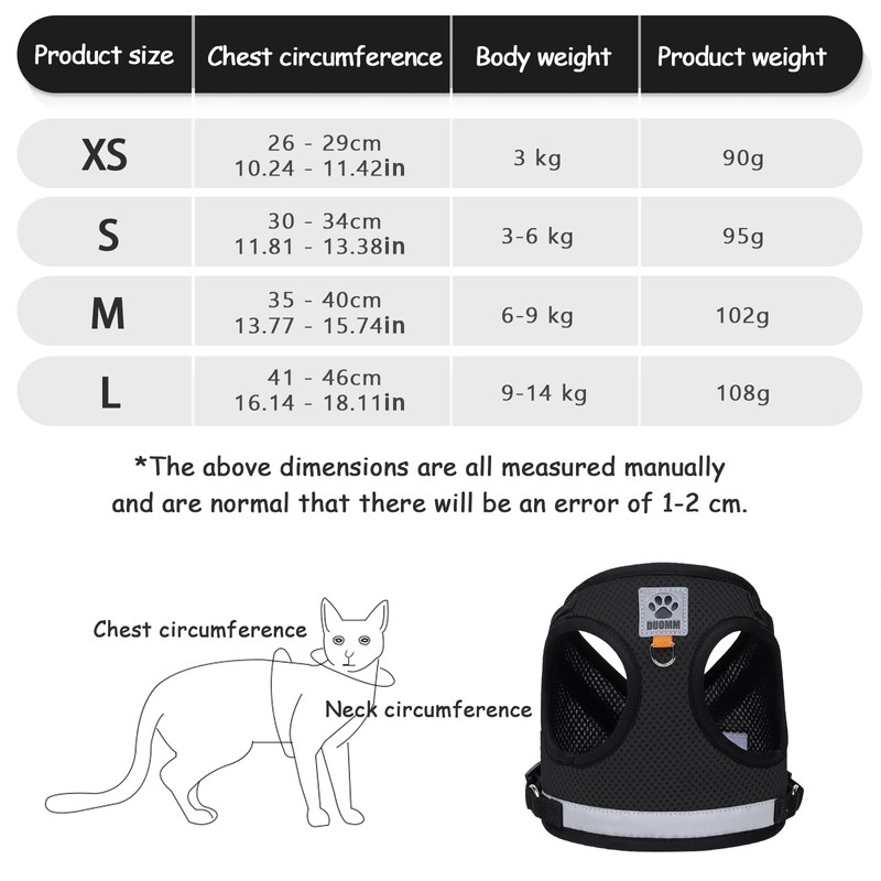 - 【Suitable Size】You will receive black XS size (Chest: 26-29cm ) cat harness with 1.5m long leash. Please measure your pet's chest accurately before purchasing, so that your pet can have a better wearing experience. For the best wearing experience, we recommend that you reducing 2~3 cm to the measured value.