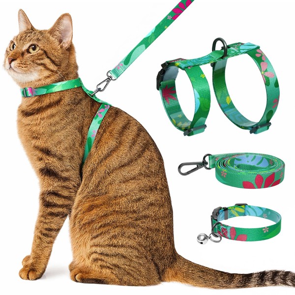 Cat Harness and Leash Set with Matching Collar – Escape Proof H-Style Harness for Cats, Adjustable & Lightweight, Tropical Hawaiian Leaf Print, Easy Wear for Outdoor Walking & Training