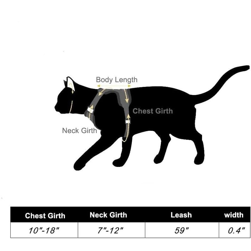 - Adjustable size: our cat harness neck circumference 19.55 cm - 30.73 inches, chest circumference 27.43 - 45.97, the lead length: 150 cm, suitable for most kittens and adult cats, please measure your cat before purchase to ensure it fits your cat.
