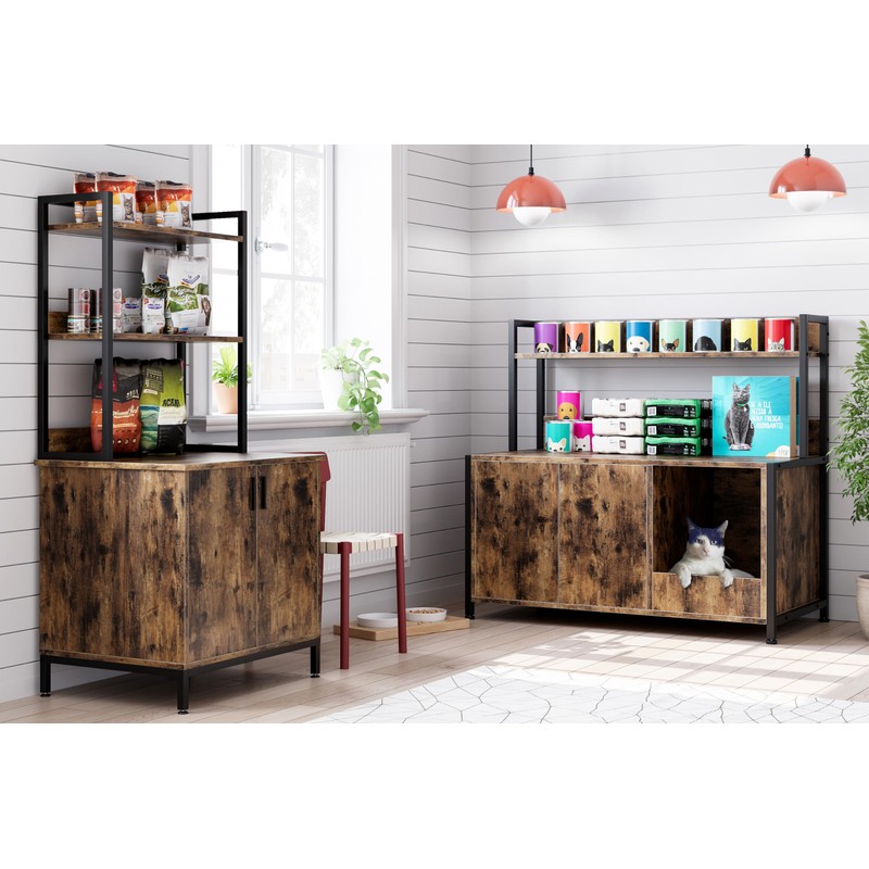 Cat Litter Box Enclosure with Shelves Storage, 2-in-1 Hidden Litter Box with Doors, Cat Wooden Washroom Furniture with Scratching Pad, Pet Storage Cabinet, Rustic Brown