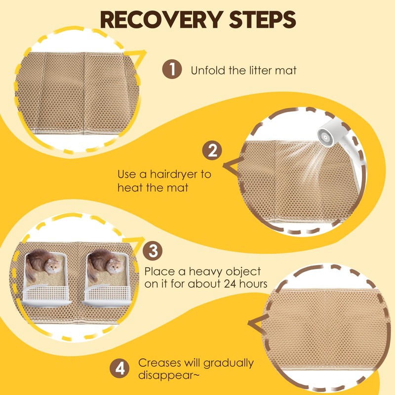 - 【Note with Care, Use with Confidence】Like most cat litter mats on the market, our Cat Litter Catcher Mat is shipped folded, which may leave some creases. However, rest assured this won’t affect its functionality. To flatten the mat, simply use a hairdryer to gently heat it and place it under a heavy object for about 24-48 hours. It will regain its smooth, flat shape in no time.