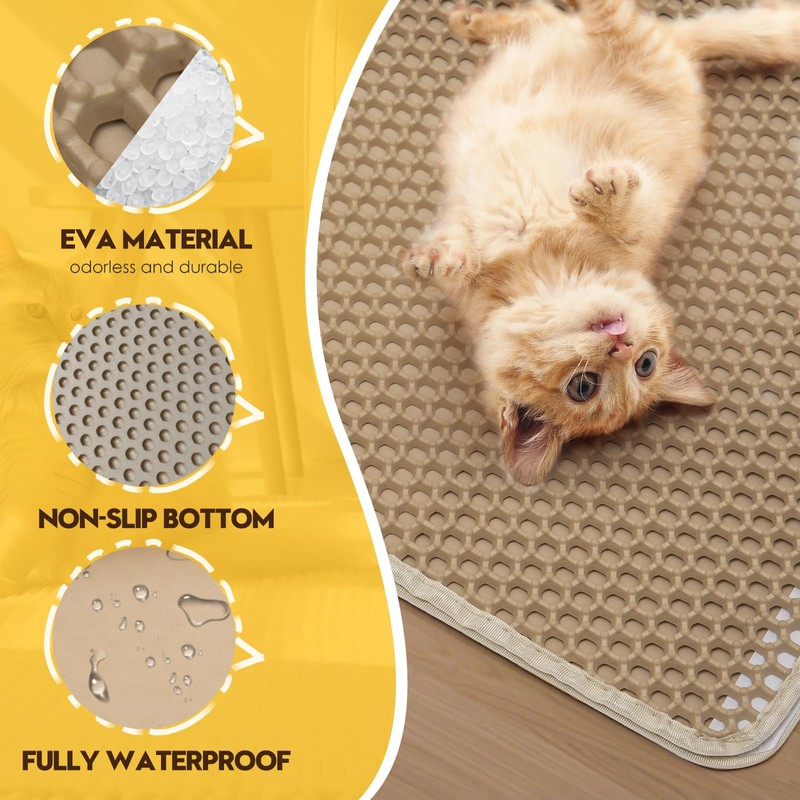 - 【Waterproof Base, Non-Slip Backing】Our Cat Litter Box Mat is made from safe, non-toxic EVA material, free of harmful substances, and gentle on your cat's sensitive paws. The Cat Litter Mat is waterproof and slip-resistant, preventing urine from seeping onto the floor and keeping the room clean and tidy. The bottom features a non-slip design, ensuring the mat stays in place and doesn't slide around.