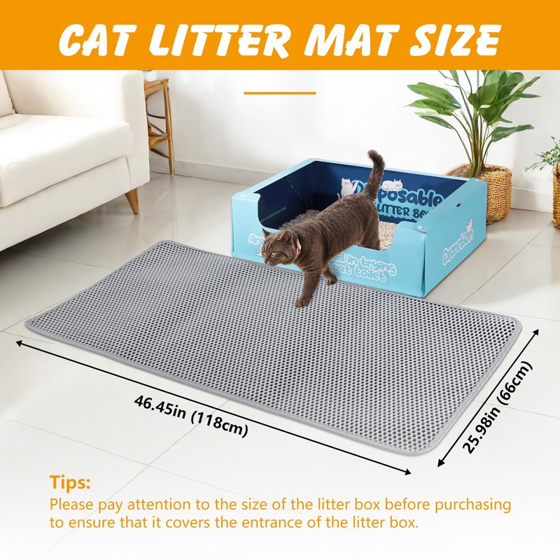 Cat Litter Mat Double Layer Non-Slip Odor-Free Litter Box Mat,Waterproof and Urine Proof Litter Mat,Scatter Control, Less Waste,Easier to Clean(Gray, 46x26 Inch)