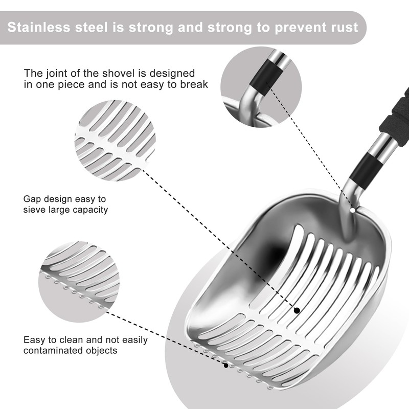 • DURABLE HEAVY-DUTY CONSTRUCTION:Crafted from high-quality metal, our cat litter shovel stands up to tough use. Rust-resistant, odor-free, and waterproof, it is designed to withstand high temperatures, ensuring long-lasting durability.