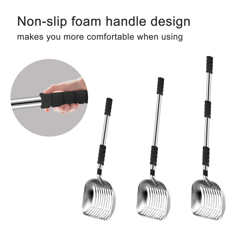 • ERGONOMIC COMFORT HANDLE:Featuring an ergonomically designed handle wrapped in soft foam, this litter scoop offers a comfortable grip for easy scooping. Its detachable design makes it user-friendly for everyone, from kids to adults.
