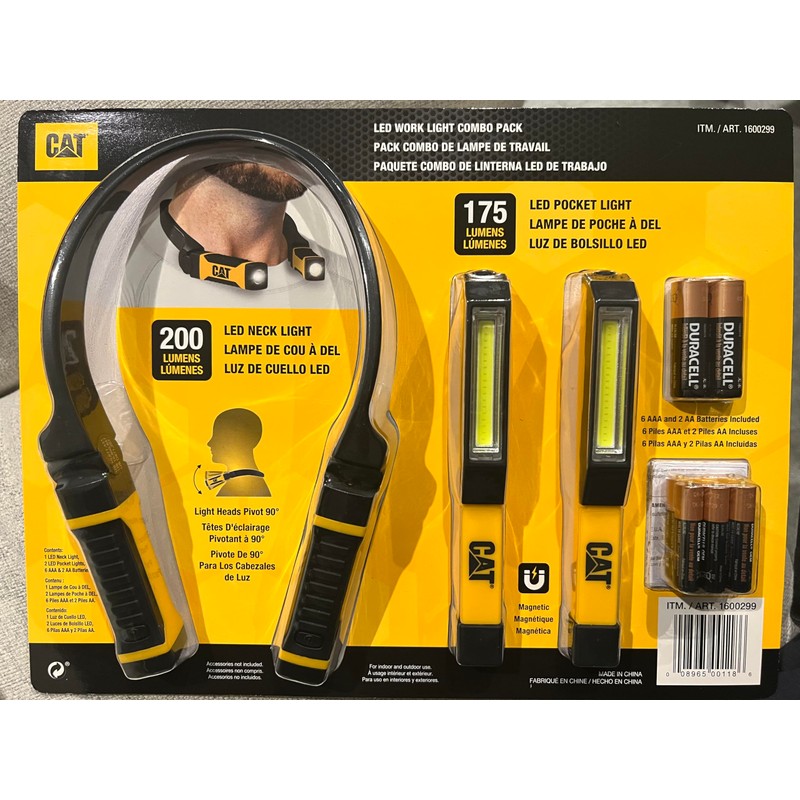 CAT Portable LED Work Light Combo 200 Lumens Neck Light Pocket Light 175 Lumens. CAT LED Work Light Combo Pack Included: (1) LED neck light (2) LED pocket lights (6) AAA Batteries (2) AA Batteries 175 Lumens LED pocket light -Rugged ABS body -Water resistant -Magnetic base -Pocket Clip 200 Lumens LED neck light -Hands free use -Each light head can be operated independently -Rests comfortably around neck -Rugged and durable -High / Low / Off power switch.
