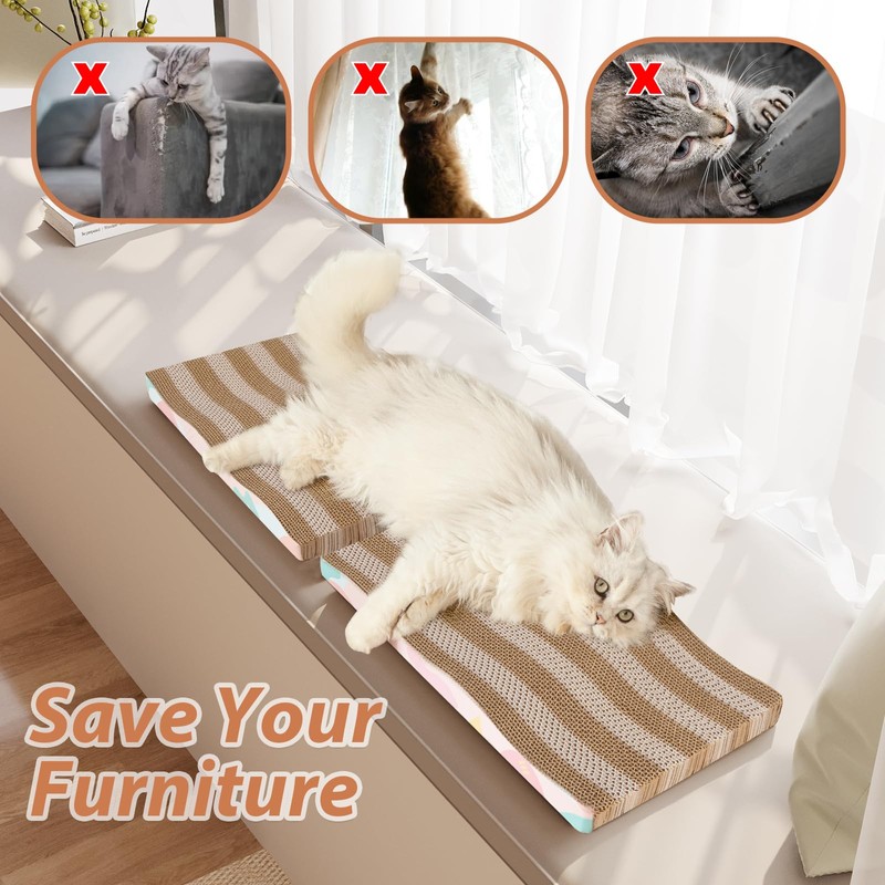 - 【Curved Wave Design】Our cat scratch pad provides a comfortable curved surface design,which can reduce the pressure on the spine and enable your lovely cats to stretch out and get momentum behind its sctatching
