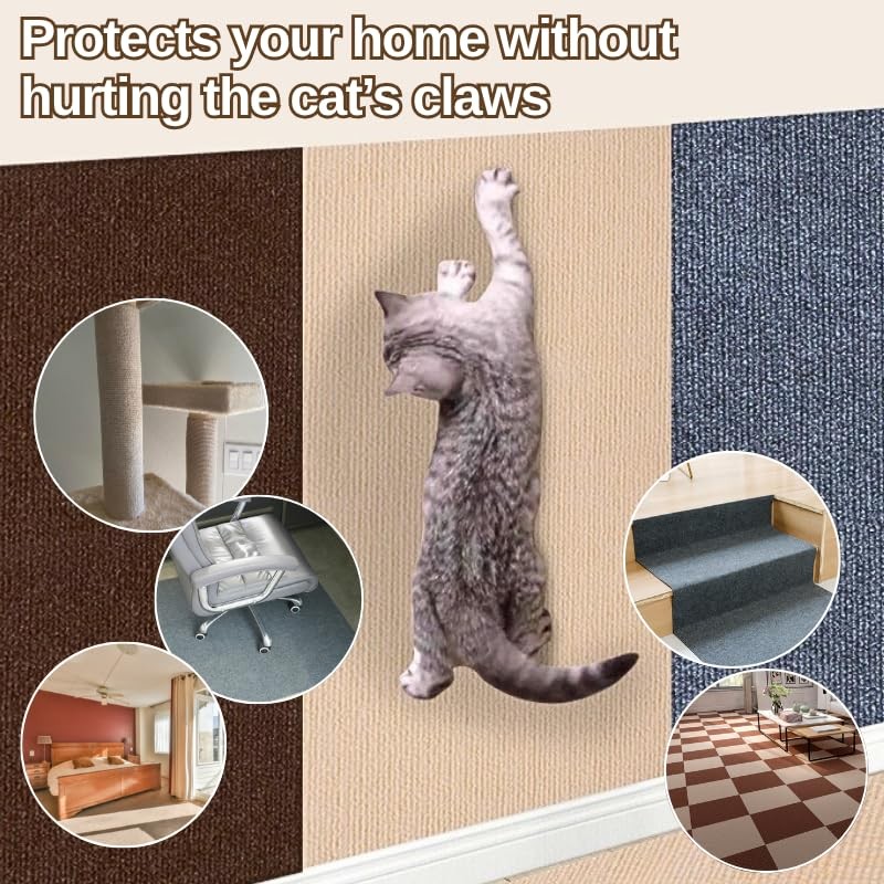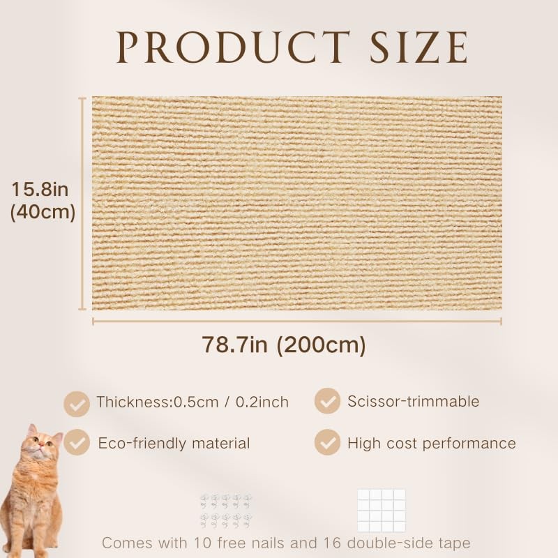 - Large Coverage for Multi-Surface Use:This large cat scratching mat measures 78.7 inches * 15.8 inches, fits wood, plastic, leather, and more. Reusable design covers shelves, stairs, cat tree replacement post, DIY climbing cat scratcher, or stick on cat scratching pads.Provides a comfortable and spacious playing and resting area for your kittens.