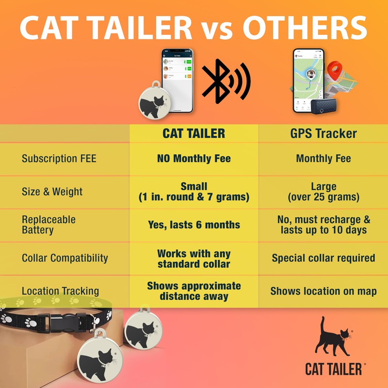 - Cat Tailer tracker tag for cat collars is the best cat tracker no subscription device in the cat accessories category that attaches just like any ordinary name tag on a pets collar; no more hide and seek!