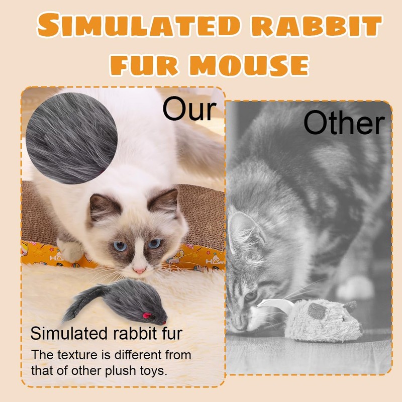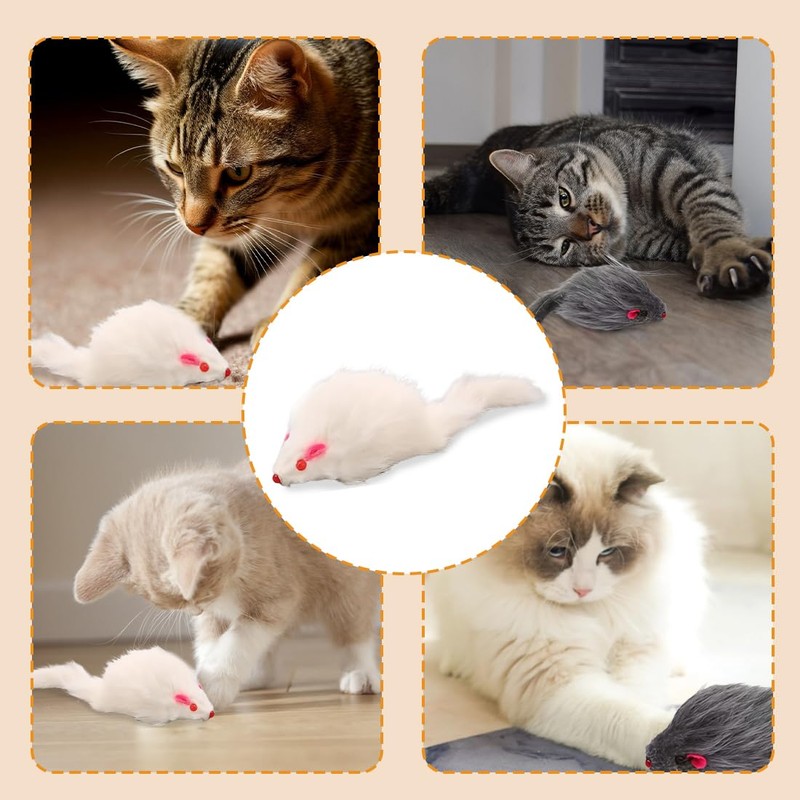 - 1. Real hunting experience: these realistically designed fur mice (black and white) awaken the hunting instinct of cats. The fluffy surface and realistic shape attract play and jump.