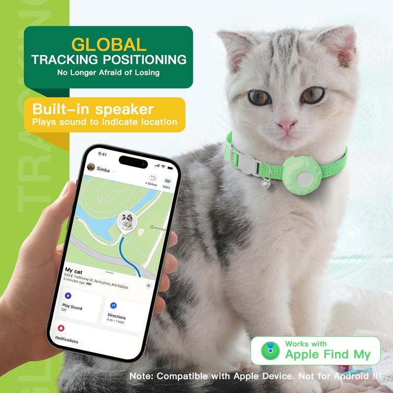 Cat Tracker Collar,No Subscription (iOS Only),Waterproof Pet Tracker for Cats with Safety Elastic Buckle,Works with Any Collar,Work with Apple Find My App not for Android-Green