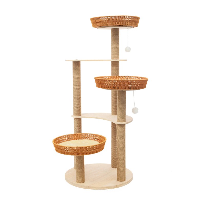 This cat tree is made of selected oak wood and jute, sturdy and wear-resistant. The tree trunk-like design will fulfill your cat's desire to climb and play. The soft cushions and white hanging balls provide a cozy playing and lounging experience for cats. It will not take up too much space for your cat to play comfortably. The cats will be able to relax in the quiet time before you return home.