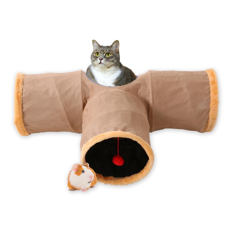Cat Tunnel & Interactive Cat Toy Indoor, Collapsible Interactive Peekaboo Cave with Play Ball, Tunnel Toys for Multi-Way Play & Small Animals, Khaki Felt/T-3 Way