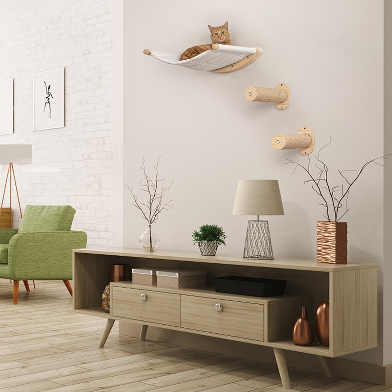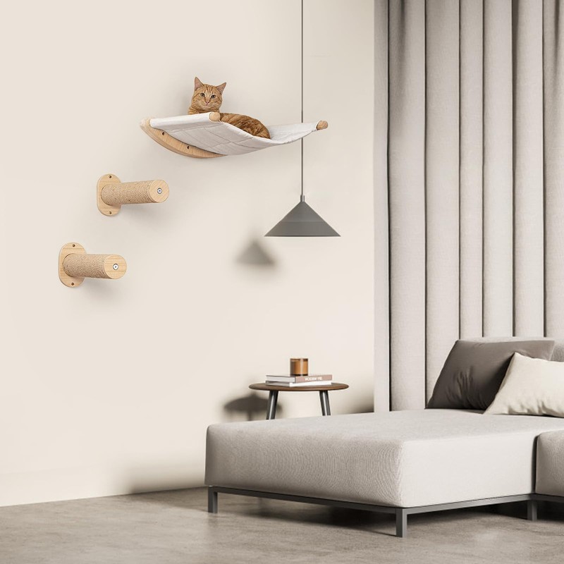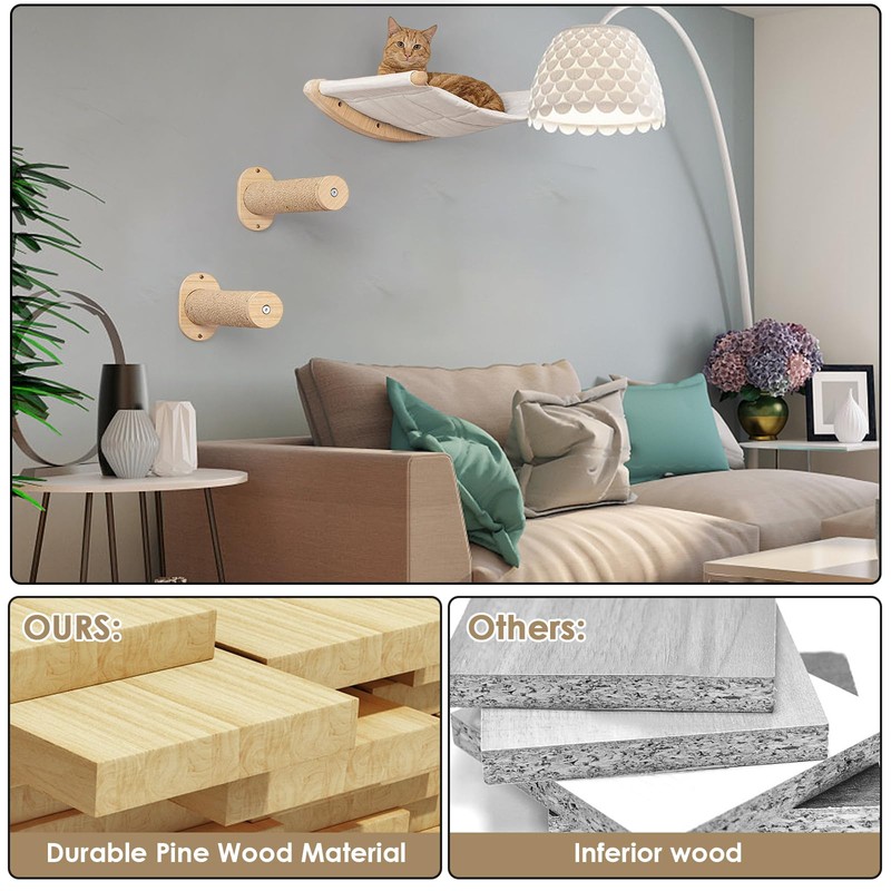 - Comfortable Cloth and Rubberwood: High-comfort wall mounted cat furniture is made of cotton and synthetic fiber cloth. Double-sided use. The cat wall furniture is easy to disassemble, install and clean, and will not accumulate cat hair and dirt
