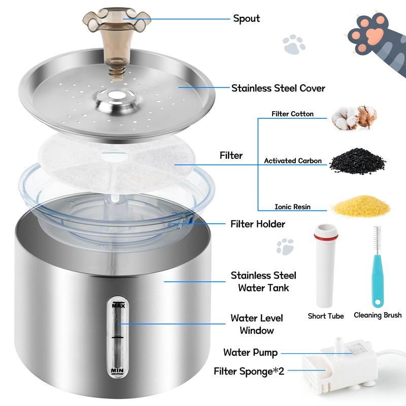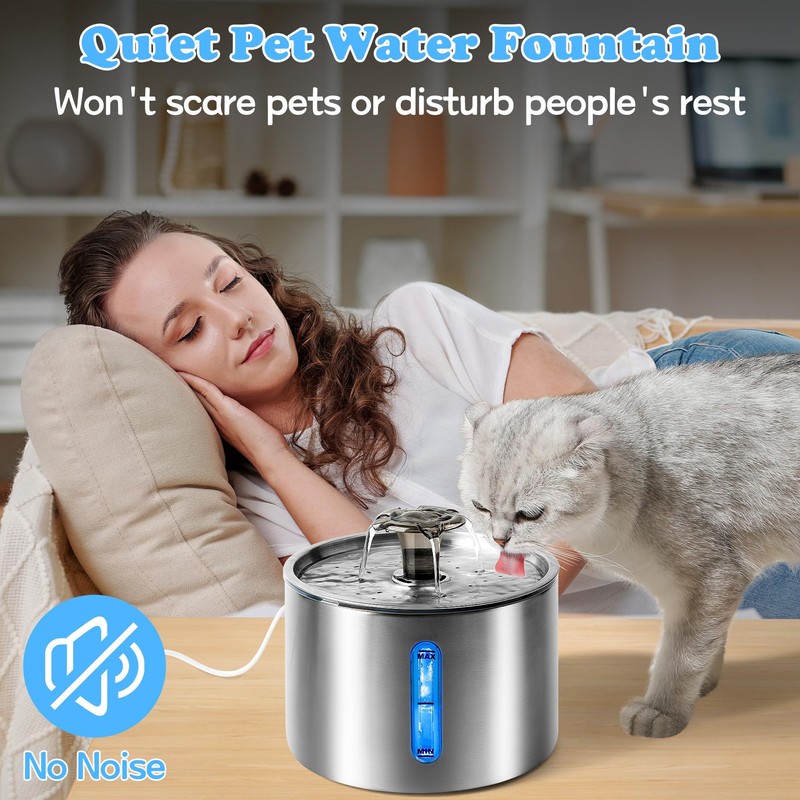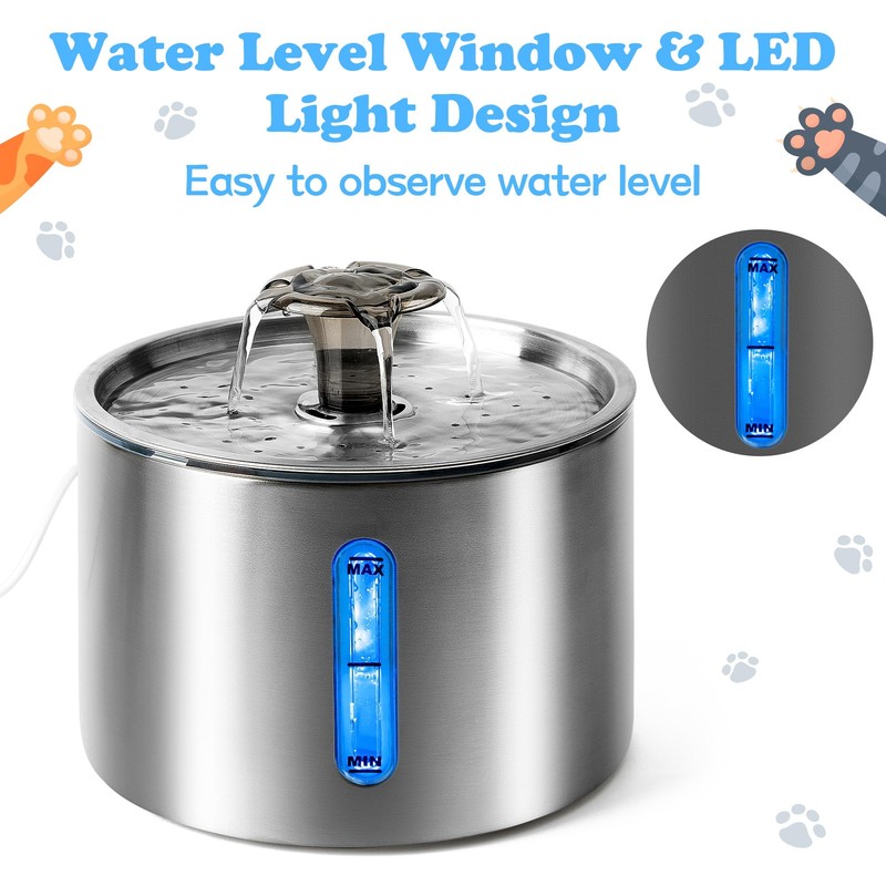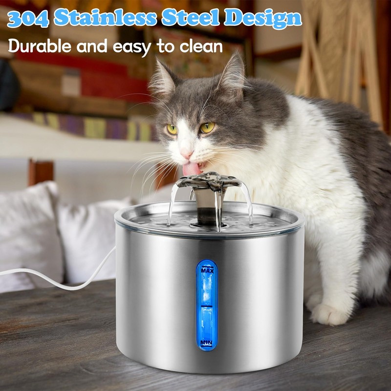 - 84oz/2.5L Large Capacity & 10-Day Water Supply Stainless Steel Cat Water Fountain With a 2.5L reservoir, this fountain reduces refills to once a week, perfect for multi-pet households. The translucent water tank and LED-lit level window let you monitor supply effortlessly, even at night.