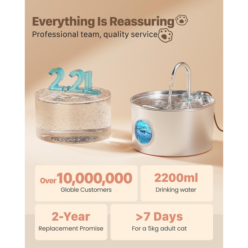 Cat Water Fountain Stainless Steel: 74oz/2.2L Cat Fountain for Drinking - Pet Water Fountain for Cats Inside - Quiet Cats Water Bowl Dispenser - Kitty Drinking Fountains - for Pets& Small Animals