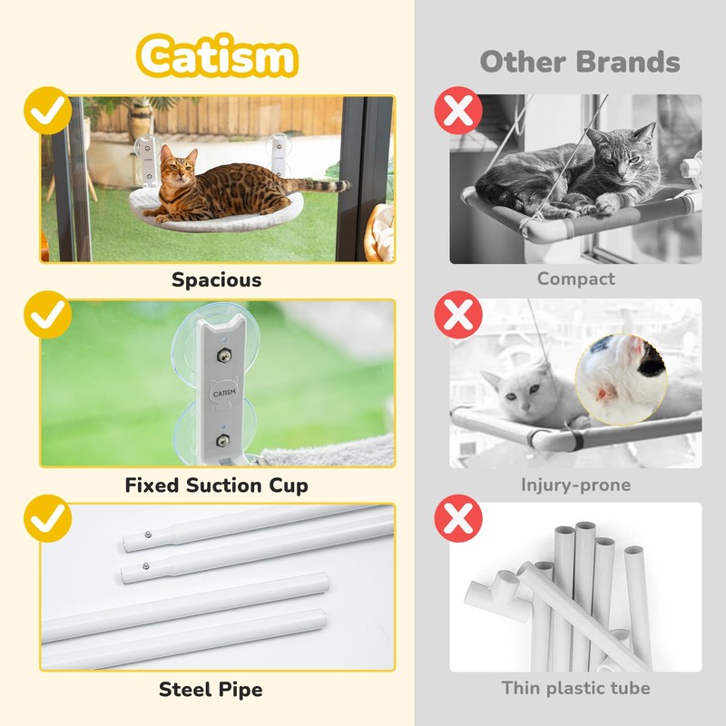 - 【Cordless & Flodable Cat Perch】CATISM cat window perch can let your cats freely jump up and down and no need to worry about them being stumbled by rope in support frame. You can also DIY a ladder that consists of 2-3 hammocks, which is fun and great for cats who love to climb. In addition, this cat window hammock is designed to be foldable, convenient and easy to restore. Just by folding it up when it is not in use