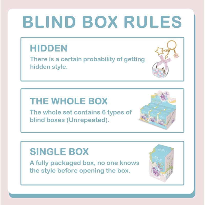 • 【About Random】NOTE: each blind box is randomly arranged. This series has 6 regular styles and 1 hidden edition (Pink And Blue Bubbles). You may get the hidden edition in any single box in probability of 1/24.