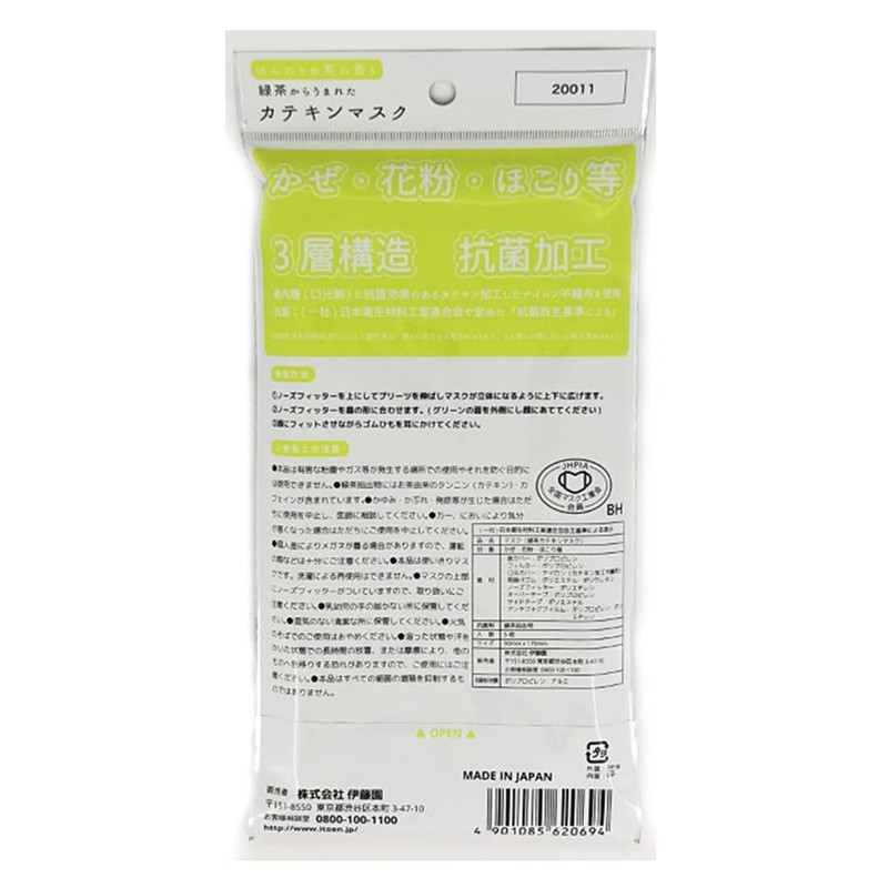 - The "Catecin Mask with Green Tea is made of non-woven nylon fabric with an antibacterial effect on the mouth side of the tea