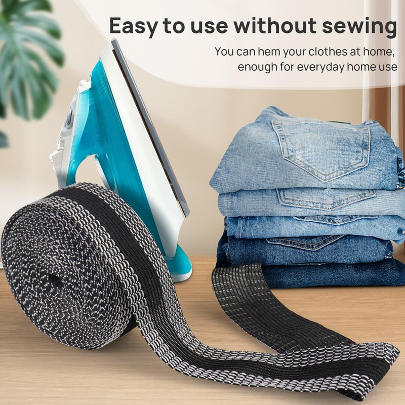 - Easy to use: Put the no-sew folding hem tape in water, then take it out and squeeze it dry. Center the white side of the tape on the seam of the pant leg. Iron for 10-15 seconds.