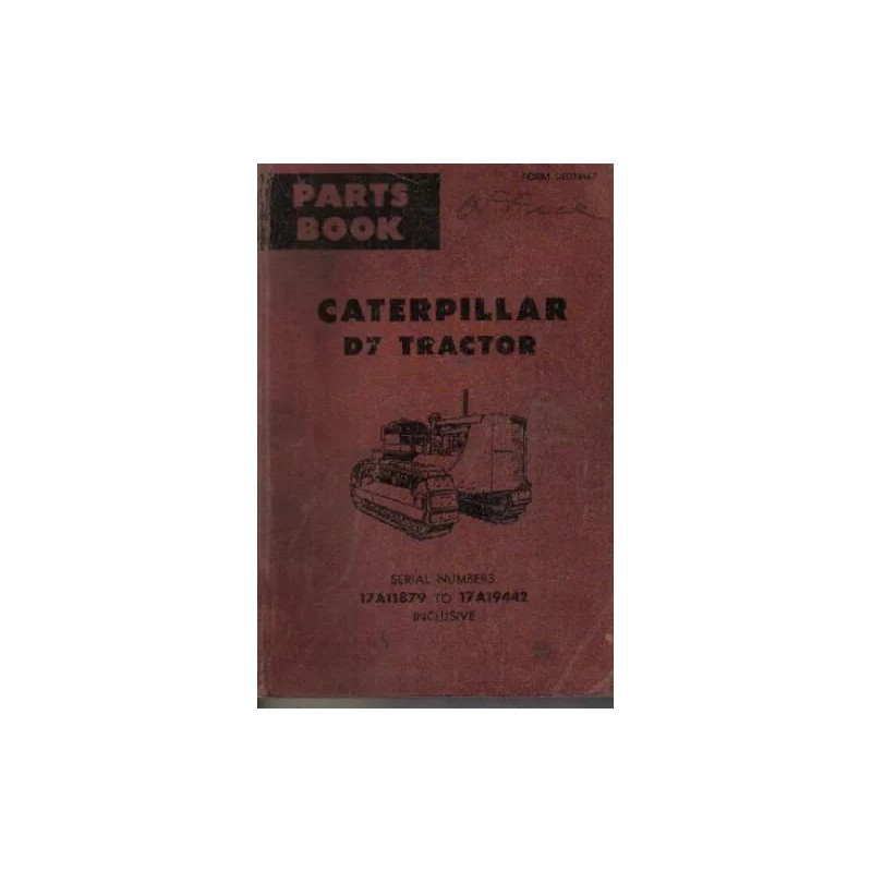 This Caterpillar D7 Tractor Parts Manual has exploded views of all parts on Caterpillar D7 Tractors with serial numbers 17A11879 to 17A19442. Includes diesel engine, starter engine, clutch, transmission and chassis, and attachments sections.