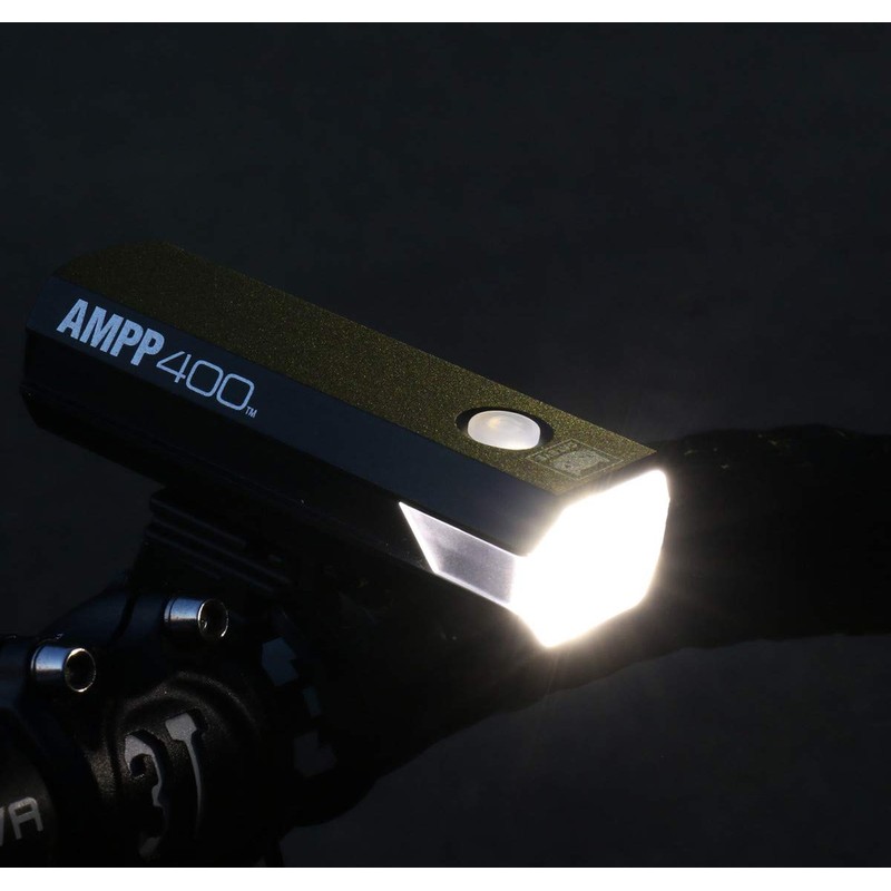 - AMPP 400: USB Rechargeable 400 lumen headlight, Four light modes (High / Low / Daytime HyperConstant / Flashing), Wide beam with OptiCube lens technology