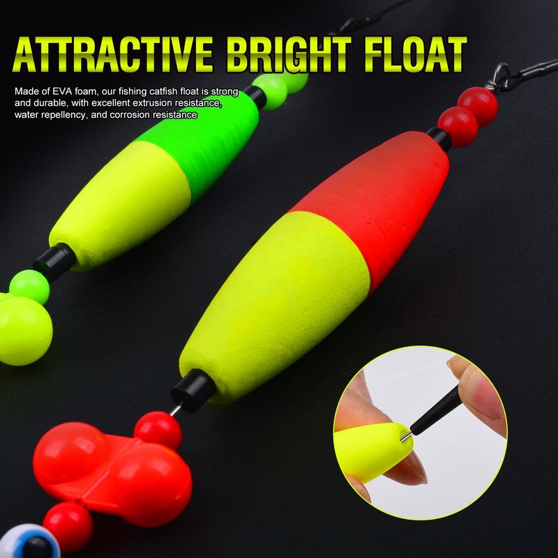 - DOUBLE RATTLE BEADS AND ADJUSTABLE FLOATS - powerful sound attraction,the included rattler emits captivating sounds that lure catfish in.the 2inch floats can be flexibly adjusted the distance between the hook.
