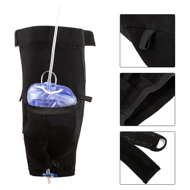 - More Thoughtful Design Increased the design of the belt, more firm and will not slip off your leg when urine bag is filling. Catheter leg bag sleeve with a pocket to hold the urine bag. Safer and firmer than the catheter strap. Place and allows free movement, but not suitable for high-intensity outdoor sports.