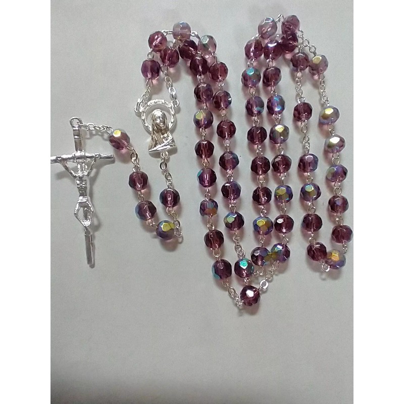 Catholic AB Purple Color Iridescent Glass Rosary Silver Tone Crucifix and Center