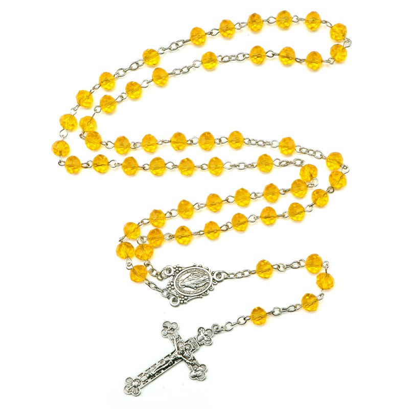 Catholic Rosary Yellow Crystal Beads Rosary Necklace with with Miraculous Medal Cross Crucifix Rosaries Communion Rosary