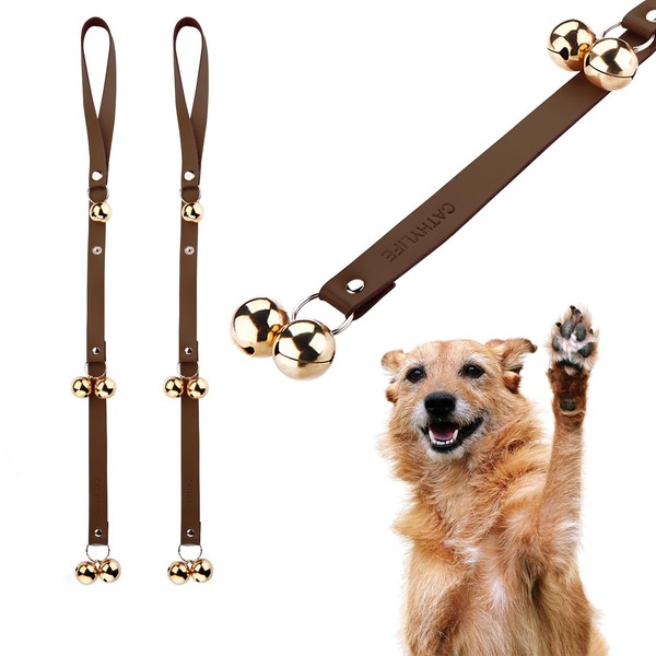 CATHYLIFE Leather Dog Doorbells for Door Knob/Potty Training/Go Outside, Length Adjustment Copper Dog Bell, Housetraining Hanging Bell, Dark Brown Leather Golden Bells - 2 Pack
