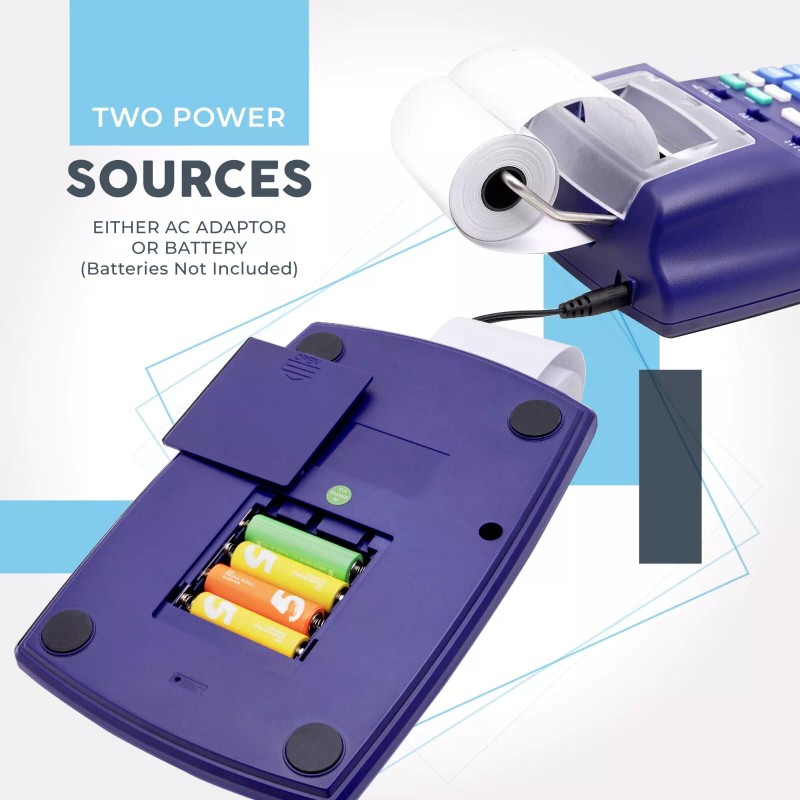 - [TWO POWER SOURCES] - An AC adapter is included so you never have to worry about running out of power. However, if you want to travel, this calculator is also for you. It supports 2 AA batteries (not included), giving you the option of mobility.