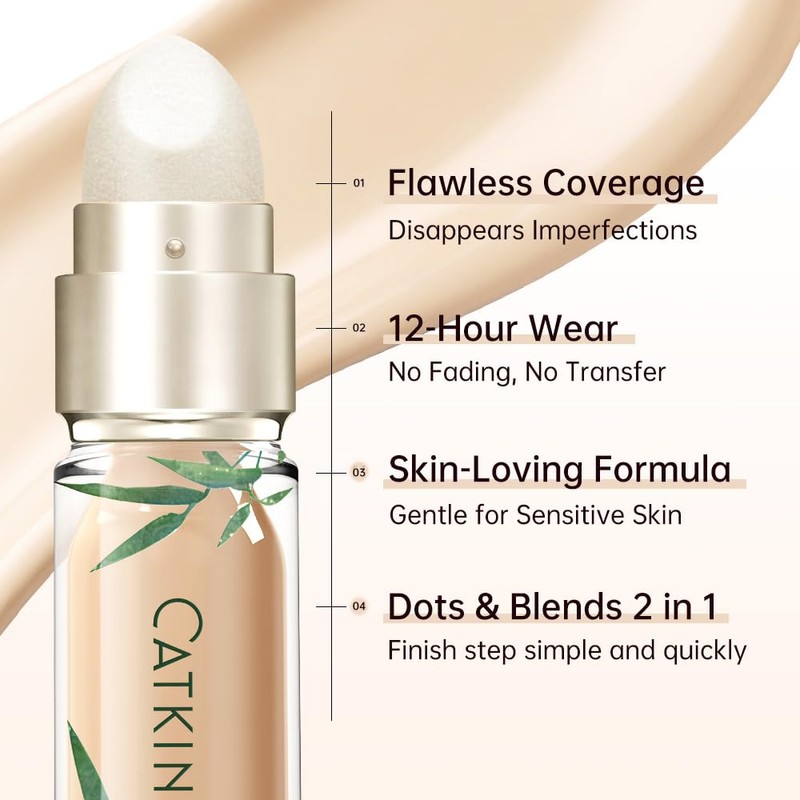 CATKIN Full Coverage Dual-Ended Liquid Concealer Eraser Dark Circles Treatment, Creamy Blendable smooth formula for Blemishes Redness, Long Lasting Waterproof, Sponge Tip Included 5g C02 COTTON