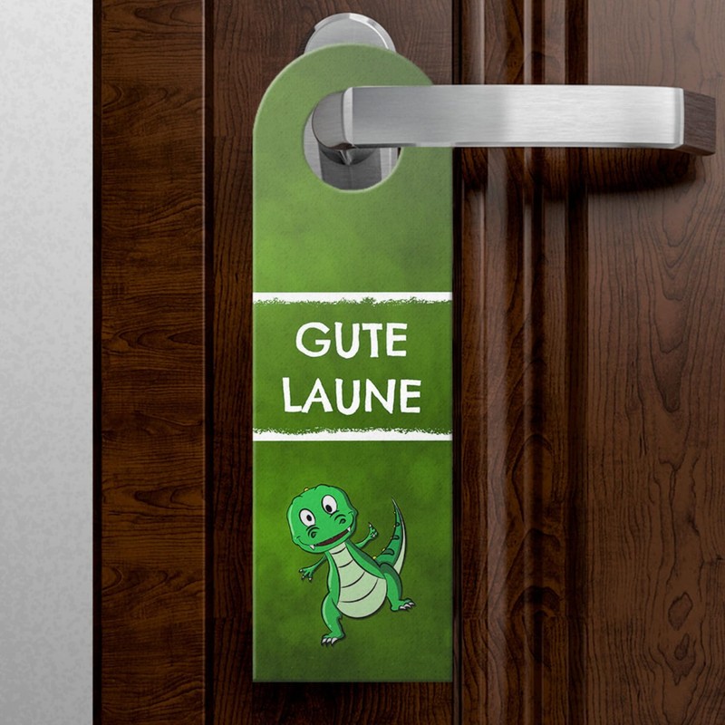 - Box contents: 1x Vorsicht schlechte Laune oder gute Laune door hanger with T-Rex dinosaur in red and green